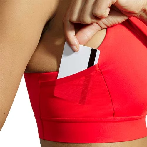 Run without worries — your search for a sports bra with phone pocket is over. This smooth, sleek bra offers motion-reducing, compressive, high-impact support and multiple pockets for storage — including one for your phone.
