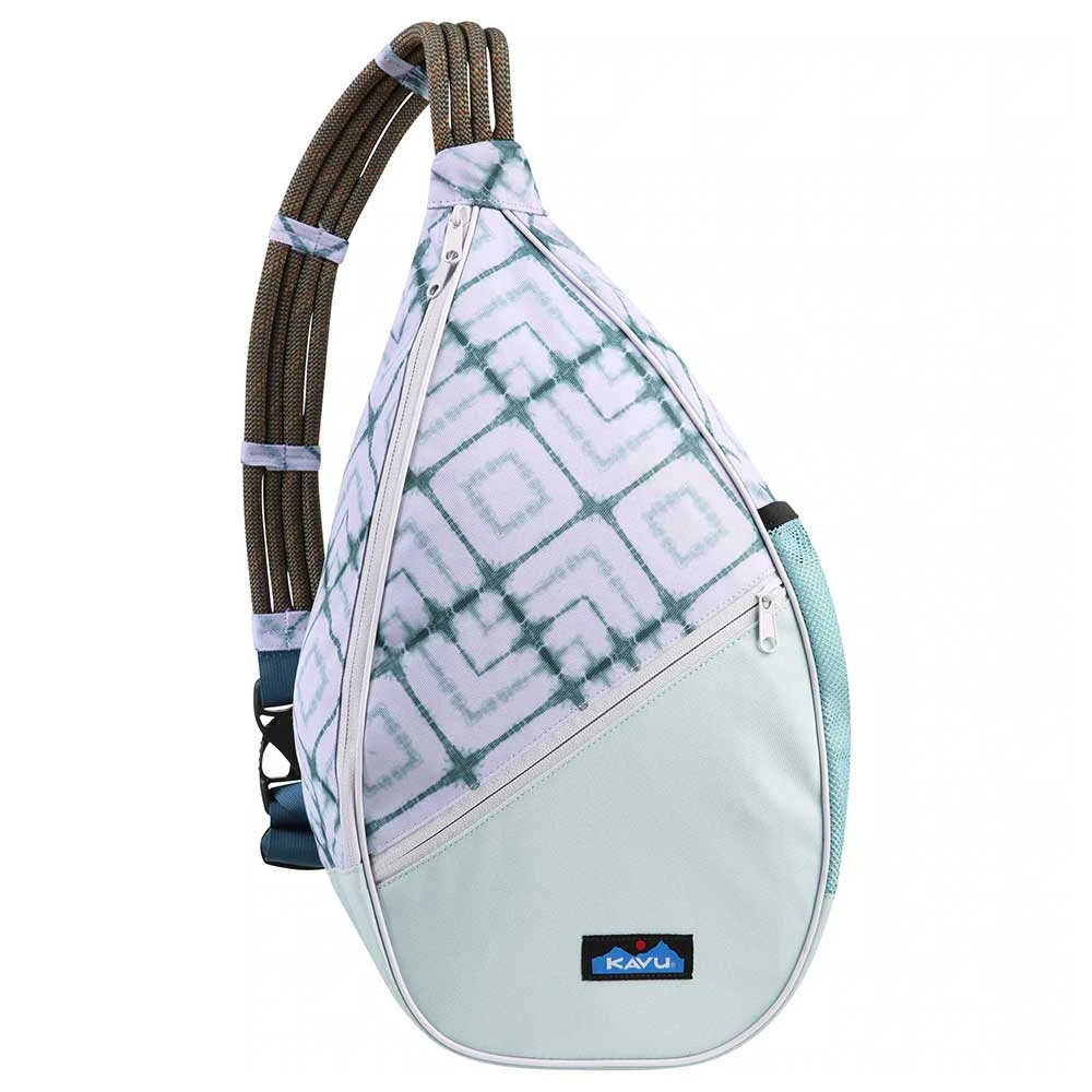 Adjustable rope shoulder strap and side release buckle, main compartment with zip closure, exterior mesh pocket, external and internal zip pockets, key clip and padded back with KAVU embroidery.