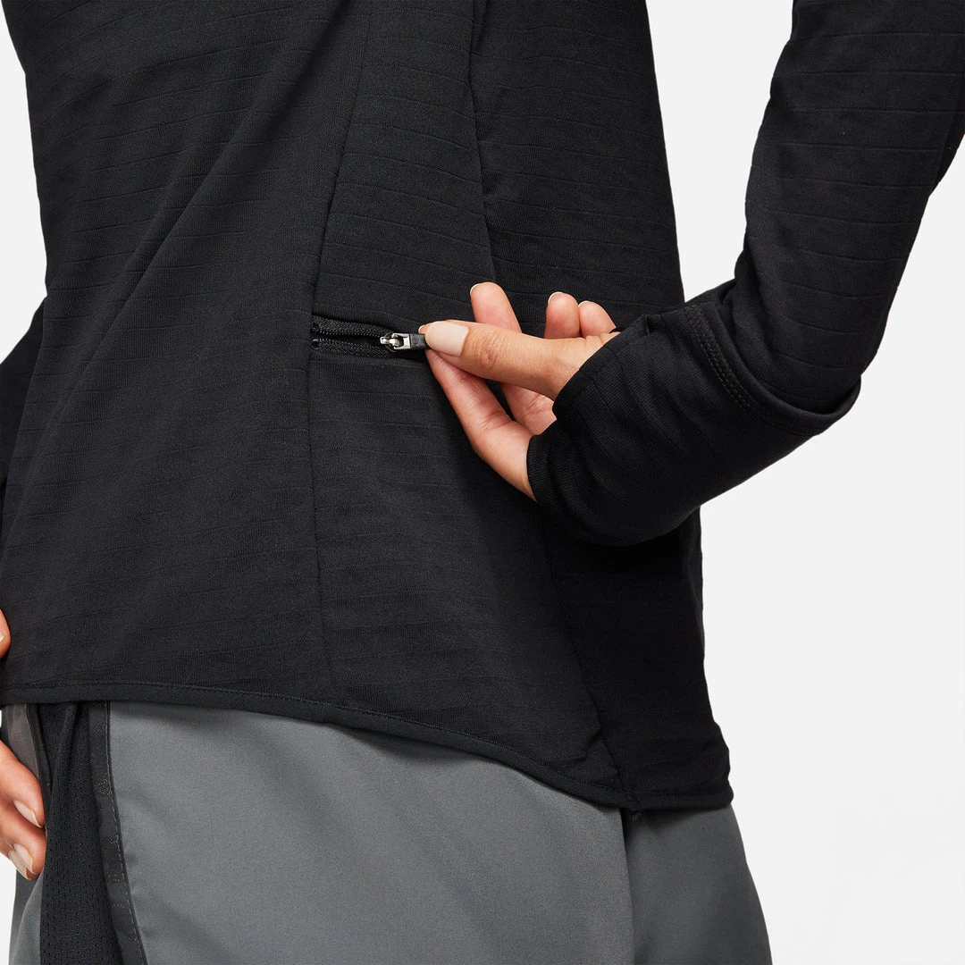 Take on your route in cooler temperatures with the Nike Therma-FIT Element Top. Its 1/2-zip design features heat-managing fabric with Swoosh-shaped nodes to help keep warmth in during cold-weather runs. Built-in mittens with thumbholes keep your hands warm. Wear it on its own or as a layering piece. This product is made with at least 75% recycled polyester fibers.